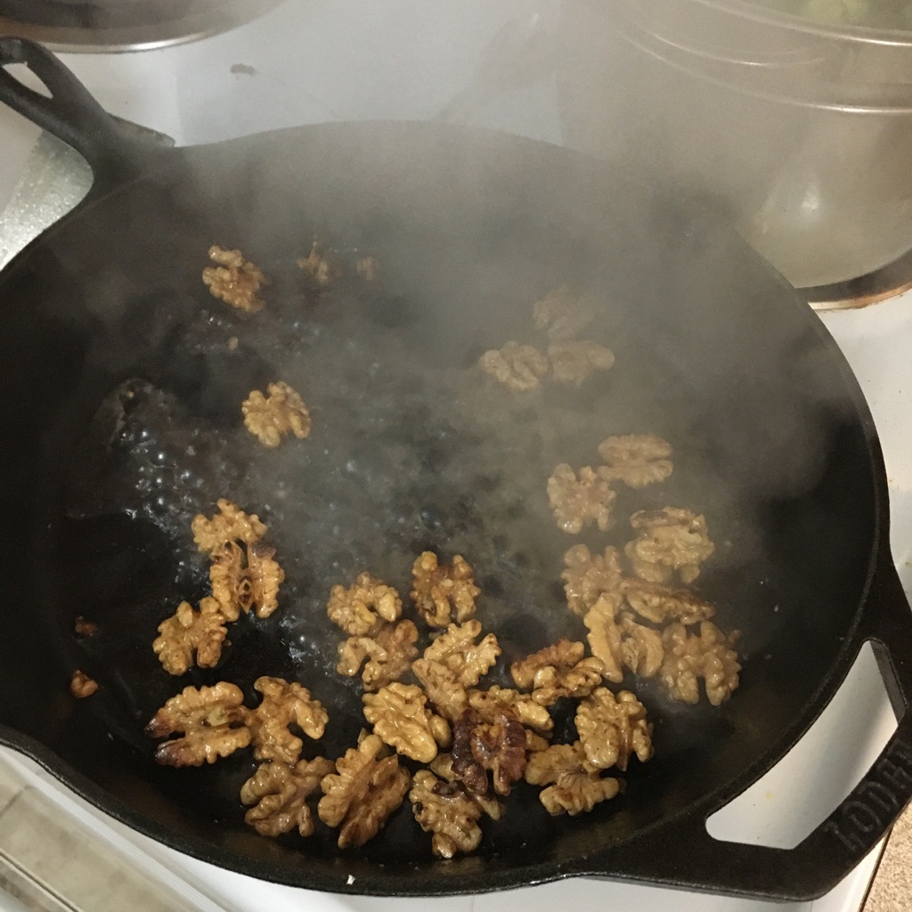 Stirring frequently, toast the walnuts until they are hot and have a few brown spots, then add the soy sauce, water and brown sugar, it will sizzle like mad and you will have to stir everything quickly and frequently!