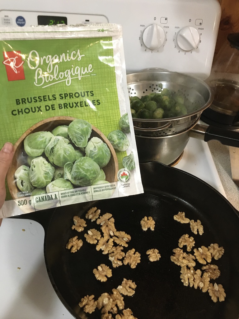 Boil or steam the frozen brussel sprouts (or fresh ones!) until jusssstttt undercooked, and set aside when ready.