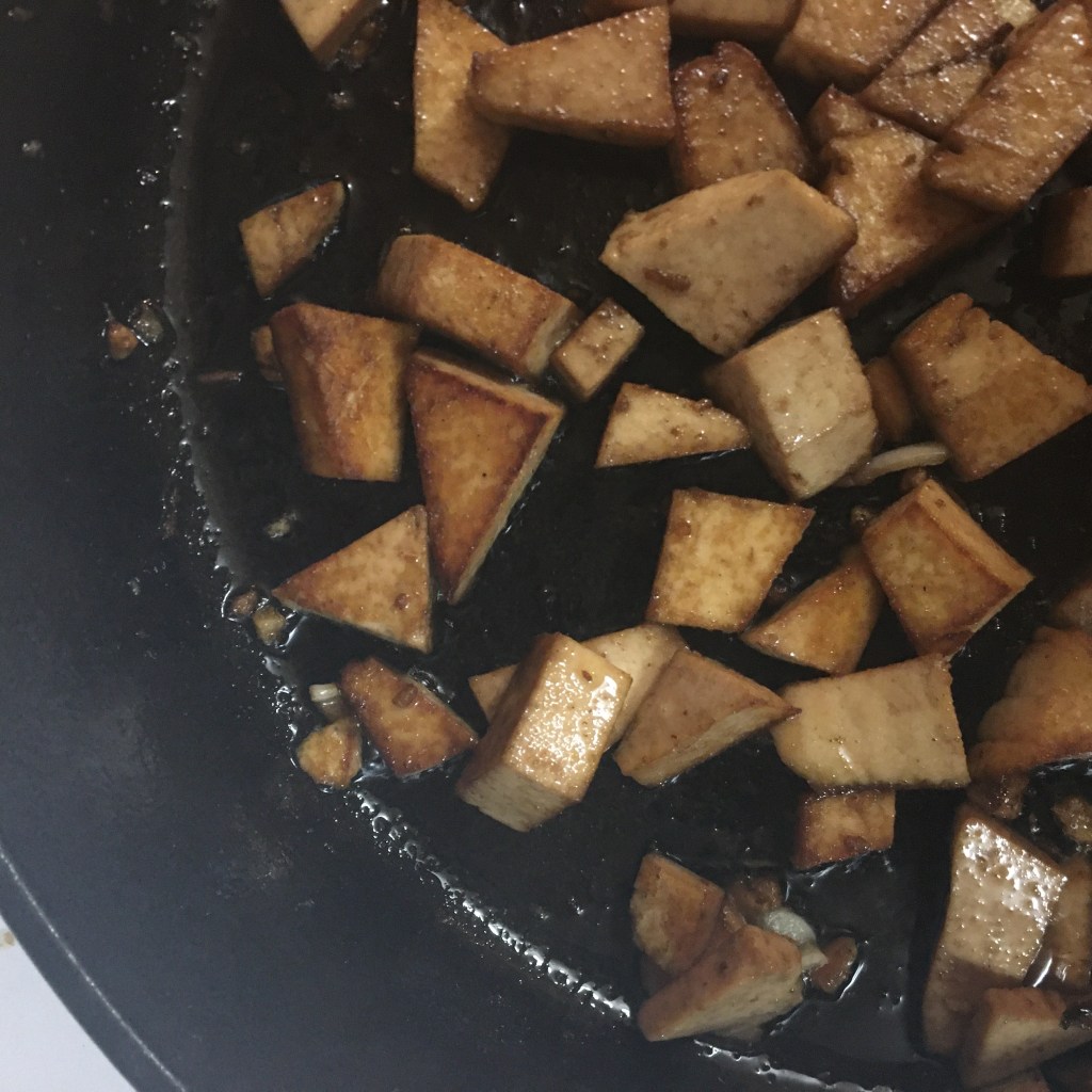 When tofu is almost ready, add a bit more marinade and let the tofu ‘steam’ until marinade is almost gone.