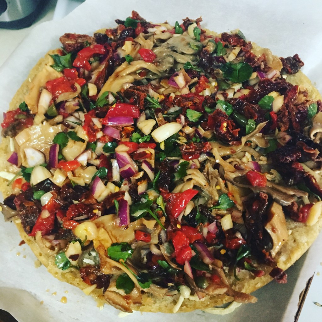 This one was made with a quick homemade vegan nut cheese, pickled cattails, roasted red peppers, garlic, onion, maitake mushrooms and of course the star of the show, daisy greens.