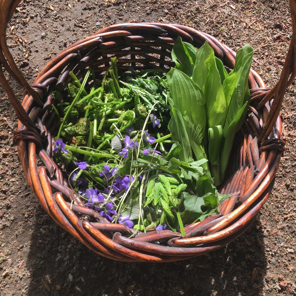 Here is one of our filled foraging baskets, you can see the daisy greens at the top centre. This haul also included hosta greens, fiddleheads, violets, spruce tips and dandelion greens.